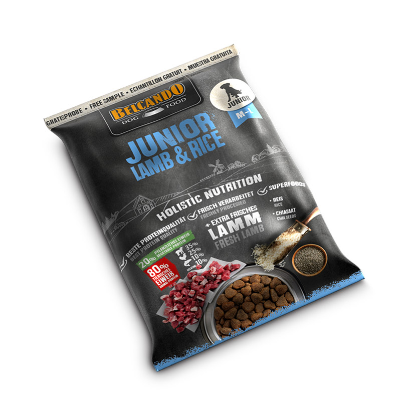 Udvalgte råstoffer med et afbalanceret forhold mellem energi og mineralstoffer sørger for en harmonisk vækst. En masse mørt lammekød og ris gør, at Belcando Junior Lam & Ris er let fordøjeligt for følsomme unghunde. Værdifulde chiafrø understøtter fordøjelsen med naturlige slimstoffer og leverer essentielle fedtsyrer.