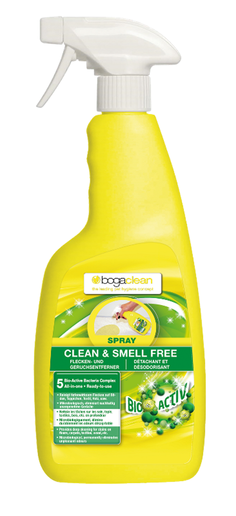 Bogaclean® CLEAN & SMELL FREE SPRAY er et meget effektivt rengøringsmiddel, der trænger direkte ind i kilden til ubehagelige organiske lugte (fæces, urin, opkast, territoriale markeringer, inkontinens mv.) og eliminerer dem permanent ved hjælp af mikrobiologiske processer.