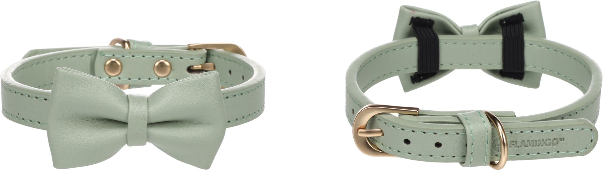 Let your furry friend shine in this trendy bow tie collar! The Nela collar in mint green faux leather is perfect for small to medium-sized dogs. The matte gold buckle and rivets add a touch of class. And the detachable bow tie completes the look!