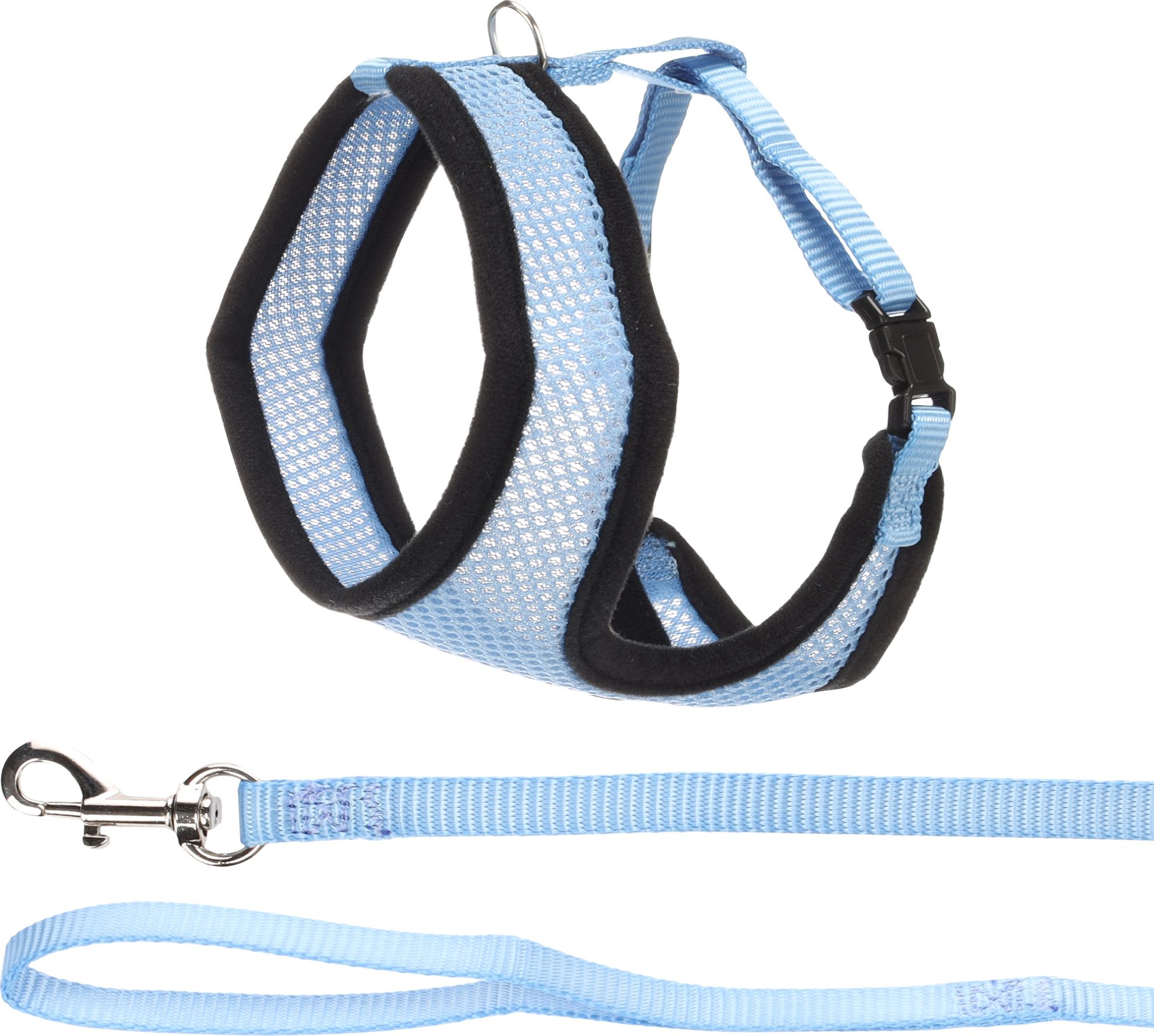 This comfy nylon harness with breathable mesh is just purrfect for your cat! Adjustable, with a click buckle and carabiner clip. Comes with a leash and chrome metal fittings.