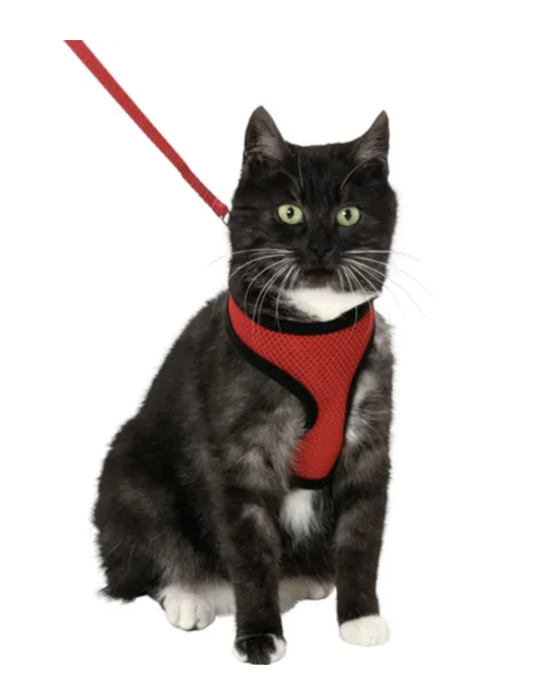The harness has a click buckle and the leash has a carabiner