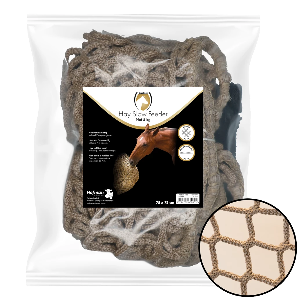 Without knots and made of very strong material (polypropylene) so that the net will last a long time. In addition, the fine-meshed net and its quality ensure less hay loss and a cleaner stable or trailer.