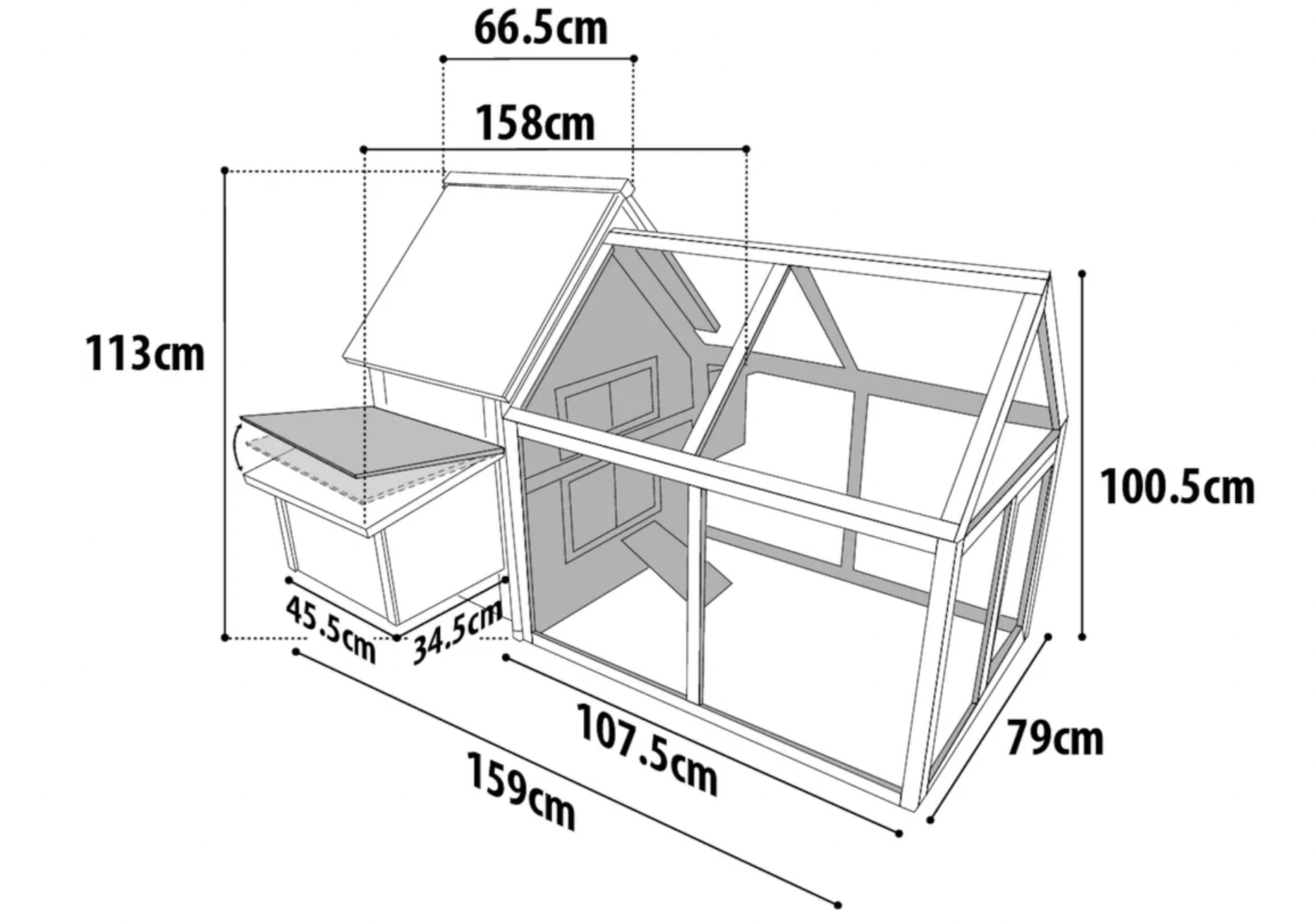 Easy to clean, Ramp, Self-assembly, Sleeping area can be closed off from the run, With metal tray, With nesting box, With plastic feet, With sliding door, With ventilation slits, Wooden roof