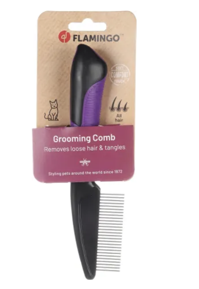 This comb with a handle is perfect for your cat or dog! The rotating teeth untangle knots without pulling and remove loose hairs. The rounded teeth protect the skin and the rubber handle provides a better grip.
