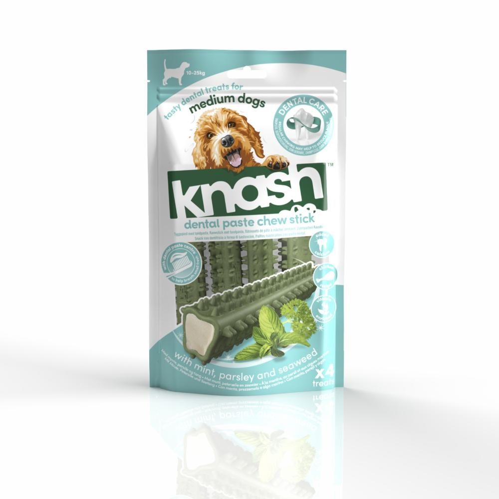 Knash Dental Paste Chew Sticks med tandpasta til hunde. Lækre og unikt formede tyggesticks med kylling, spækket med velsmagende grøntsager og uden tilsatte kunstige farve- eller smagsstoffer. Med hørfrøolie, der indeholder omega 3- og 6-fedtsyrer, der fremmer sund hud og pels og og med calcium til knogler og tænder.