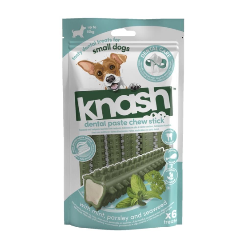 Knash Dental Paste Chew Sticks med tandpasta til hunde. Lækre og unikt formede tyggesticks med kylling, spækket med velsmagende grøntsager og uden tilsatte kunstige farve- eller smagsstoffer. Med hørfrøolie, der indeholder omega 3- og 6-fedtsyrer, der fremmer sund hud og pels og og med calcium til knogler og tænder.