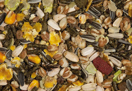 Majs, solsikkefrø, lucerne, hvede, ærteflager, byg, johannesbrød, boghvede, soja, roer, jordnødder, melorme, timothy hø, gulerodsskiver,