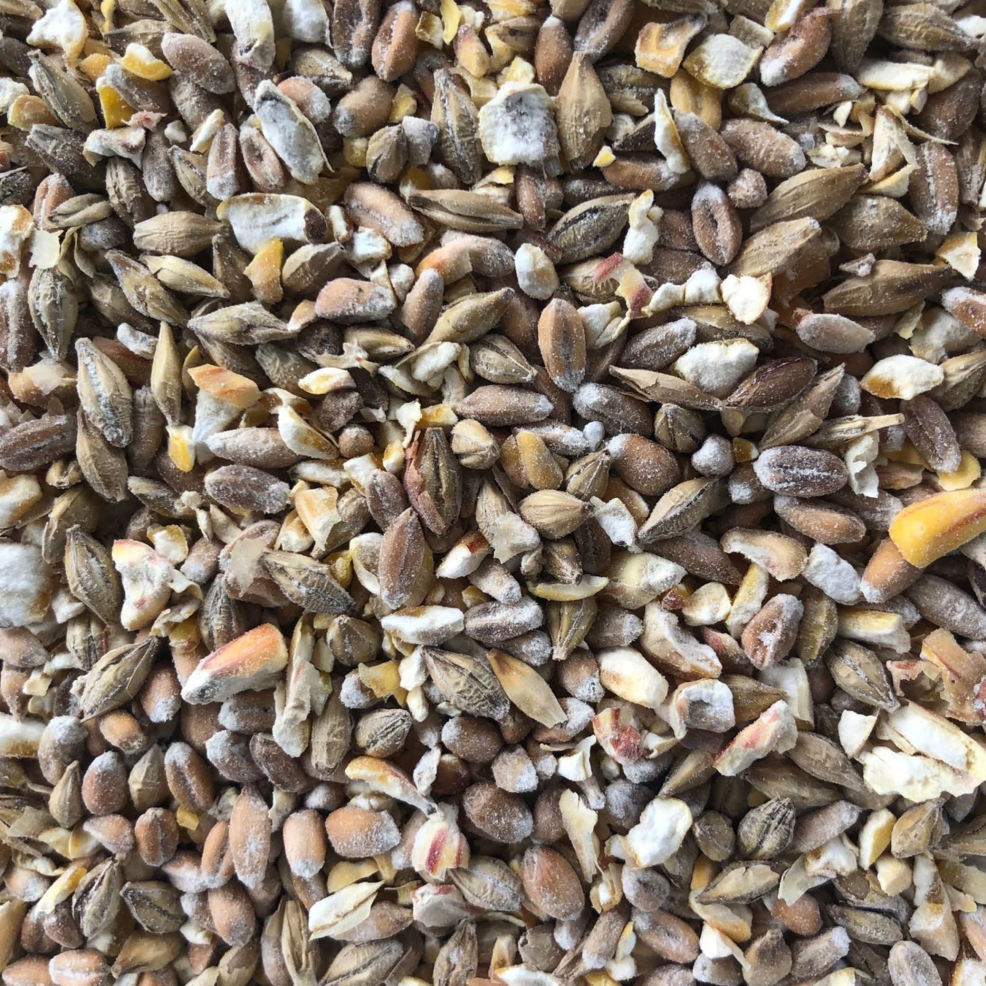 Hønsekorn er en blanding af: 30% hvede, 30% byg, 40% knækkede majs