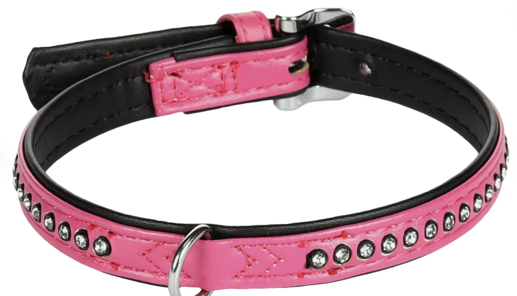 Make your furry friend shine with this colourful collar adorned with sparkling rhinestones and silver accents. The convenient D-ring allows for easy attachment and detachment of the lead. Ready, steady, go!
