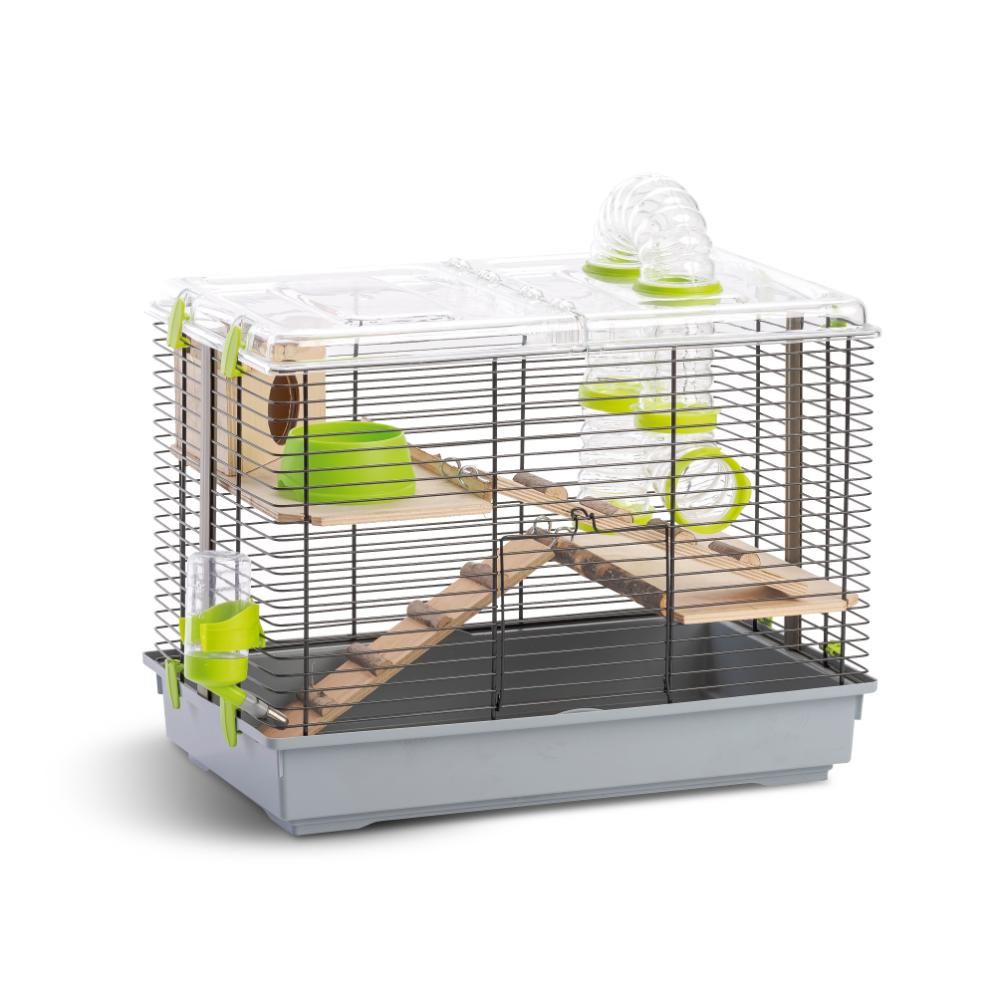 Hamsterbur Pino Natura fra firmaet MPS2. Hamsterbur med tremmer i metal og plastbund. Top i plastik med låge og tunnel. Med hule, platforme og stiger i træ og madskål og drikkeautomat i plast.