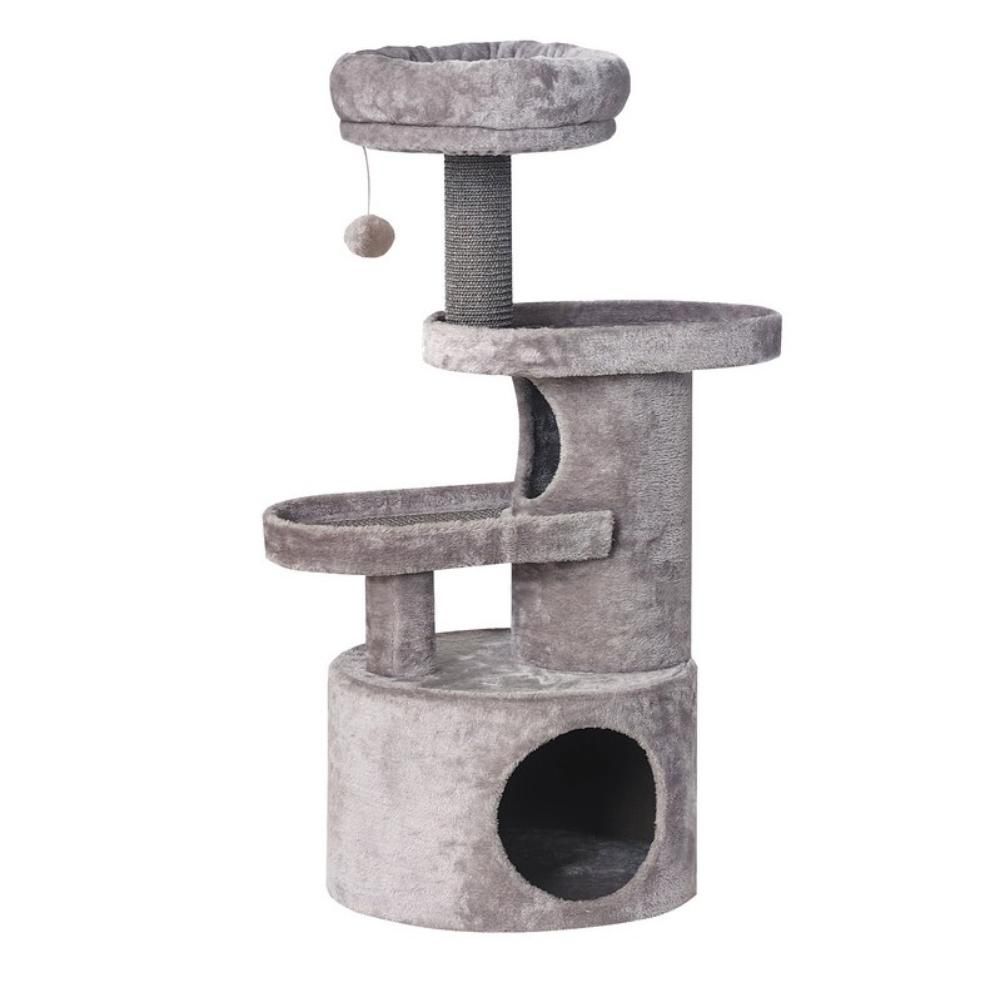 Juno kradsetræ af mærket Nordic Paws. Hyggeligt kradsetræ beklædt med lækkert gråt plys. Med hule, 2 platforme og en blød seng øverst. Kradsestolpe og kradseområde beklædt med sisalreb.