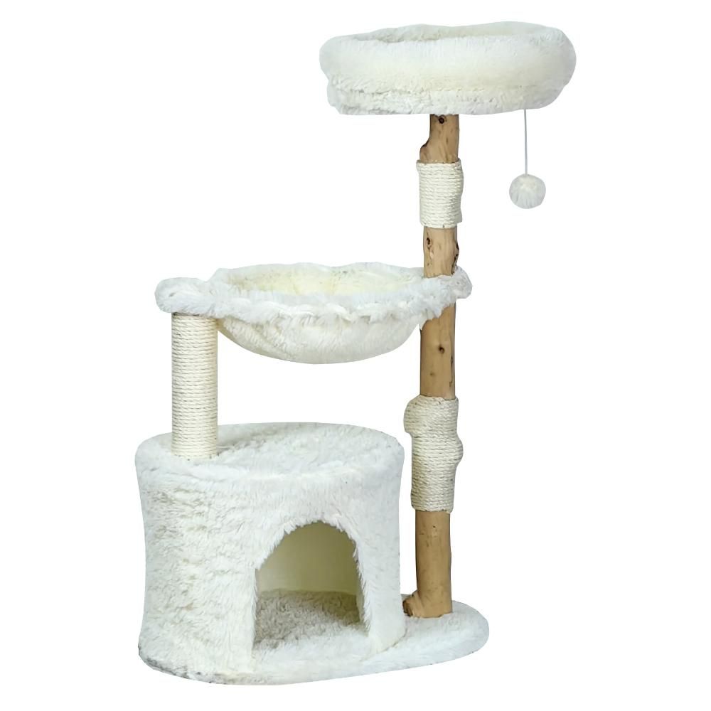 Wildwood 3 kradsetræ af mærket Nordic Paws. Flot kradsetræ med hule og senge beklædt med lækkert plys. Med naturlig træstolpe med sisalreb.