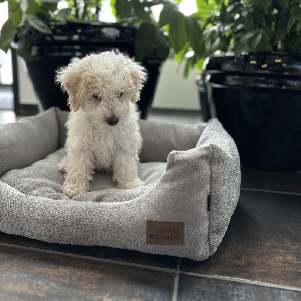 Pine hundeseng af mærket Nordic Paws. Blød og hyggelig hundeseng i groft vævet stof med vendbar pude med plys, og anti-skrid bund, så den ligger godt fast på gulvet.
