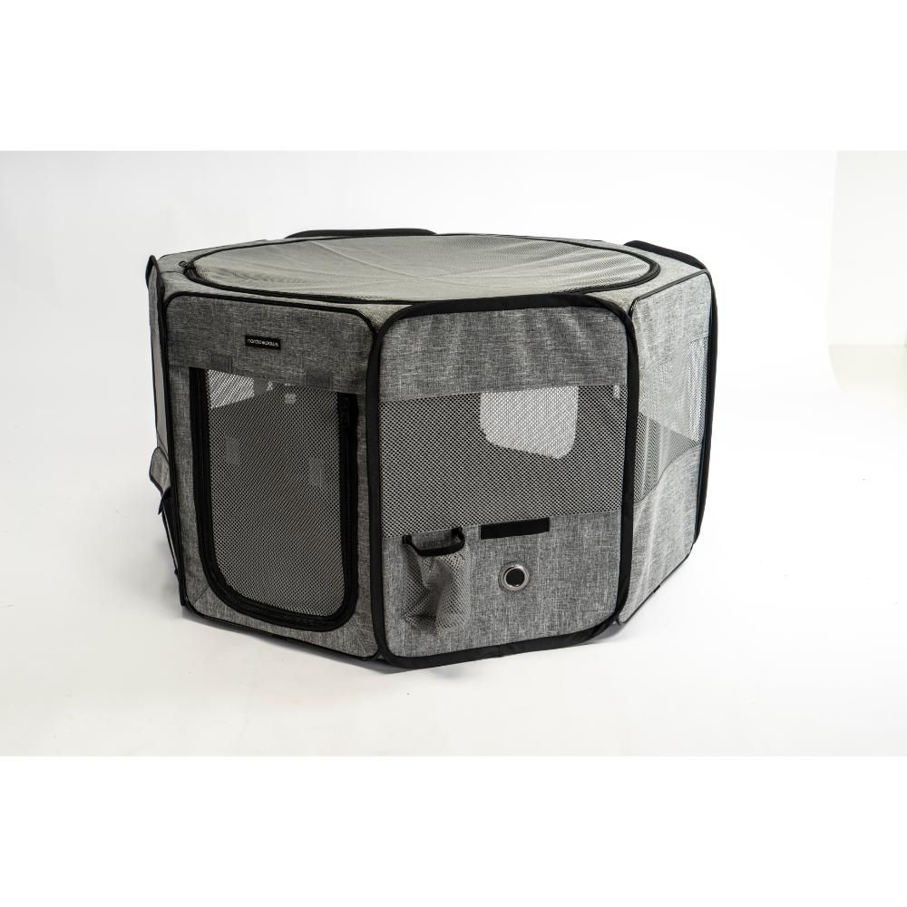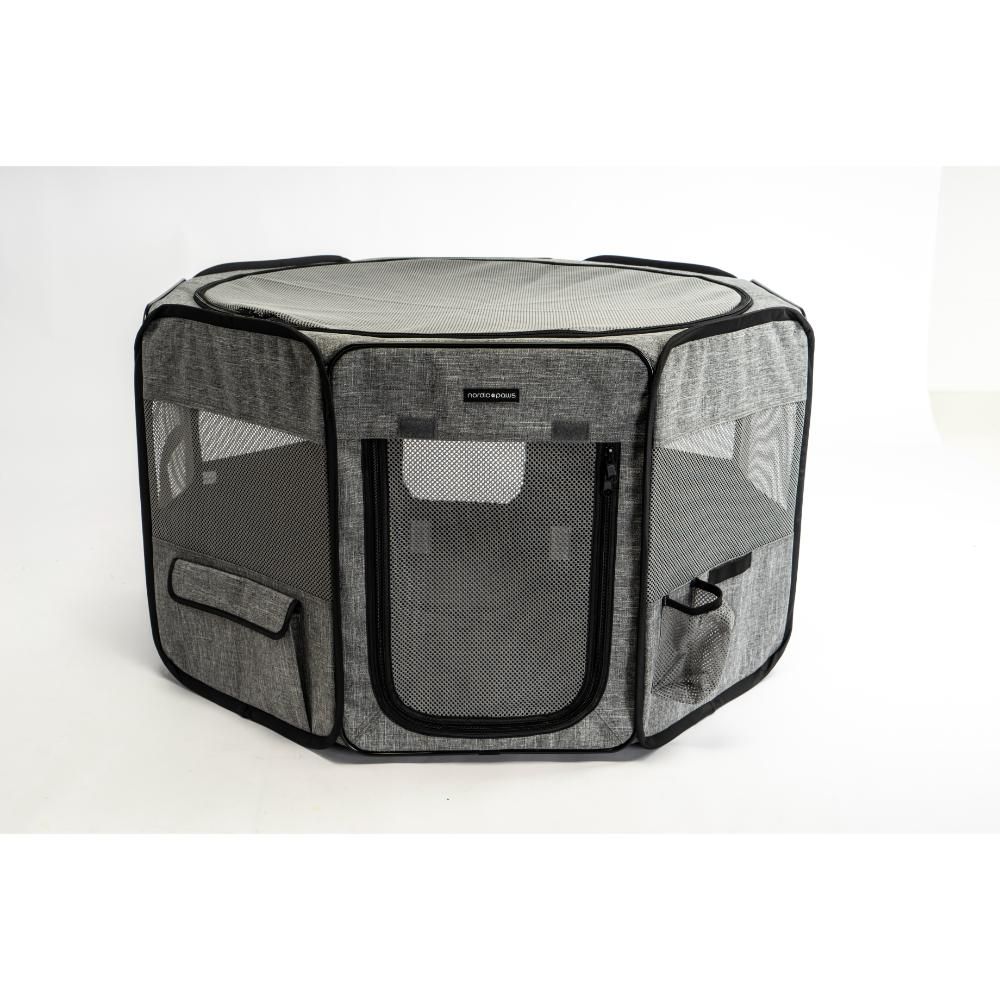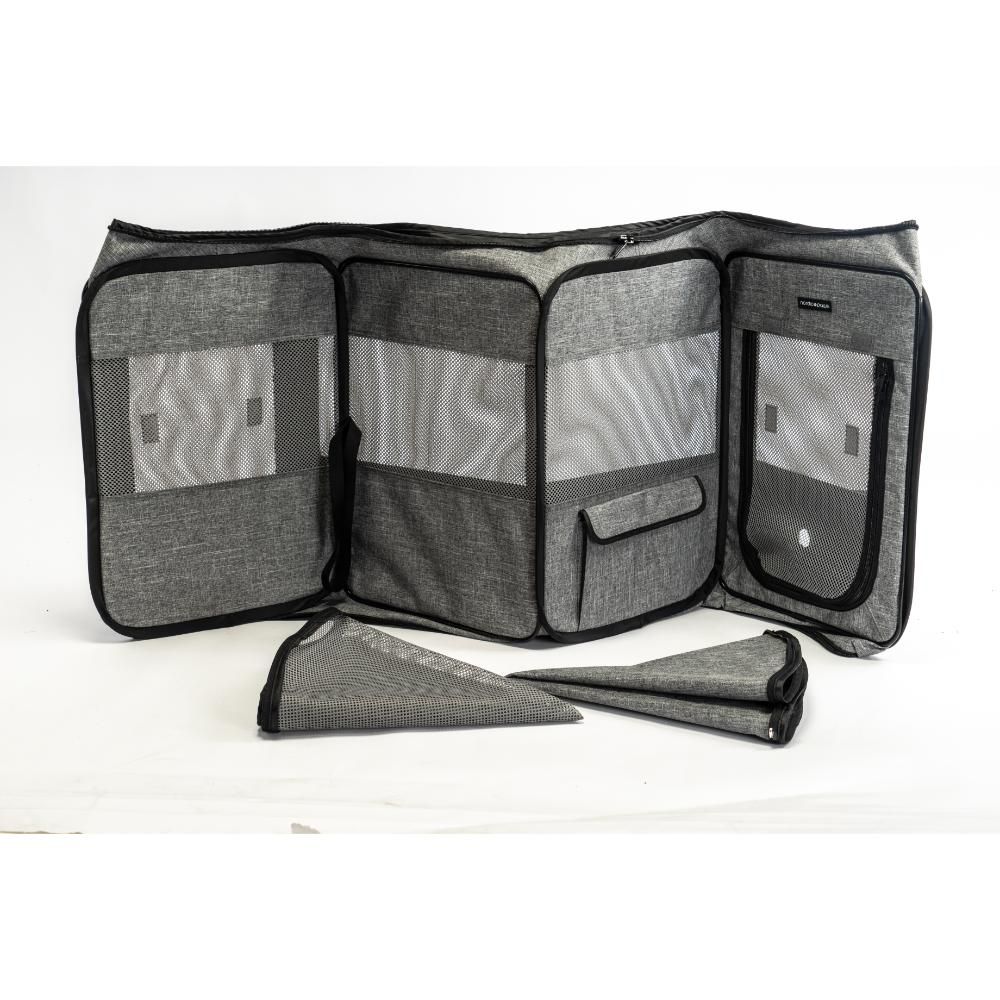 Foldbar løbegård i stof af mærket Nordic paws. Kan anvendes til små hunde, hvalpe, katte eller små kæledyr som kaniner og marsvin. Med mesh for god ventilation. Kan åbnes både i siderne og i toppen. Med lommer til opbevaring af godbidder, hømhøm-poser, vandflaske m.m. Str. 92 x 92 x 53 cm.