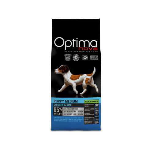 Optimanova Medium Puppy Chicken & Rice er et fuldkostfoder til hunde.