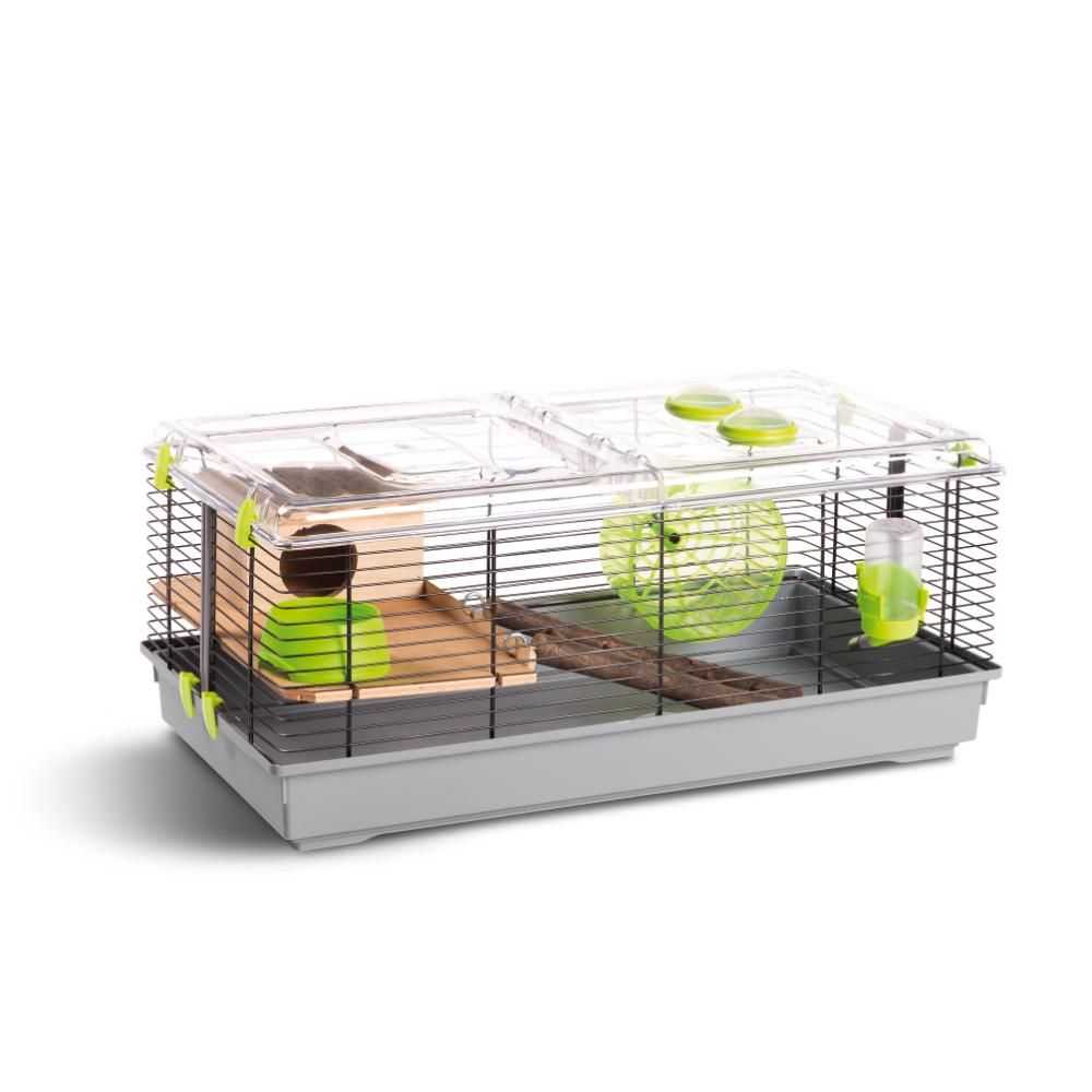 Hamsterbur Trudy Natura fra firmaet MPS2. Hamsterbur med tremmer i metal og plastbund. Top i plastik med låge. Med hule, platform og stige i træ. Madskål, drikkeflaske og løbehjul i plast.