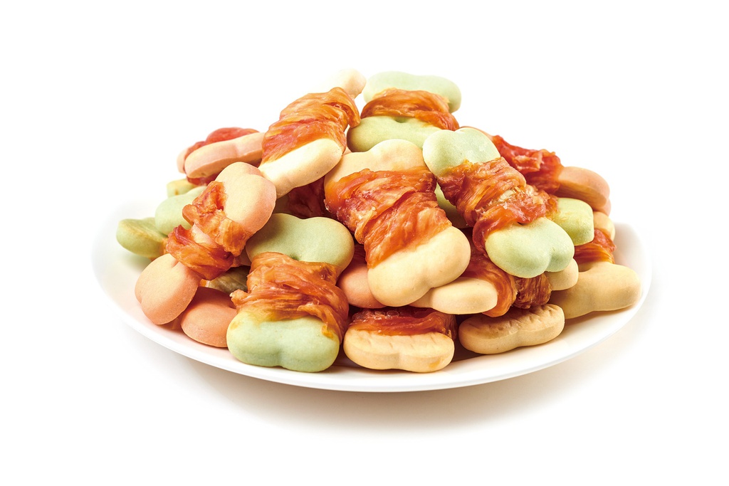 Ingredienser: Kylling, hvedemel, sukker, palmeolie, glycerin, vegetabilsk protein, stivelse, lecithin, salt, calciumcarbonat, gelatine, oligosaccharider, flaovone, farvestofferAnalyse: Protein 22,0%, fedt 7,5%, fibre 0,5%, aske 2,5%, vand 12,0%