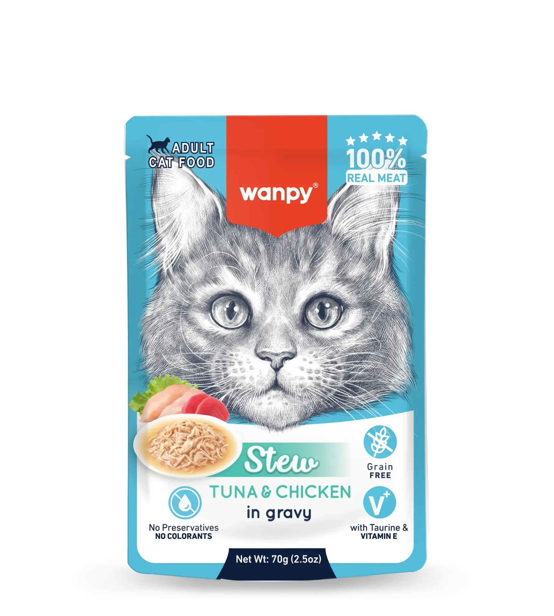 Wanpy Cat Stew med tun og kylling i lækker sovs er 100% ægte kød og helt uden korn, farvestoffer eller konserveringsmidler.